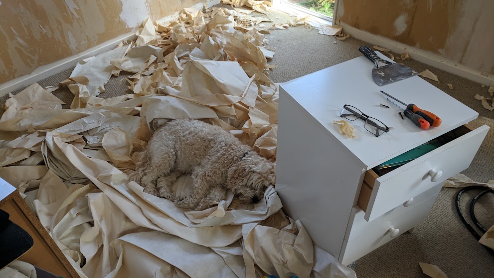 Stripping wallpaper at David and Lee's house - can you see Charlie?